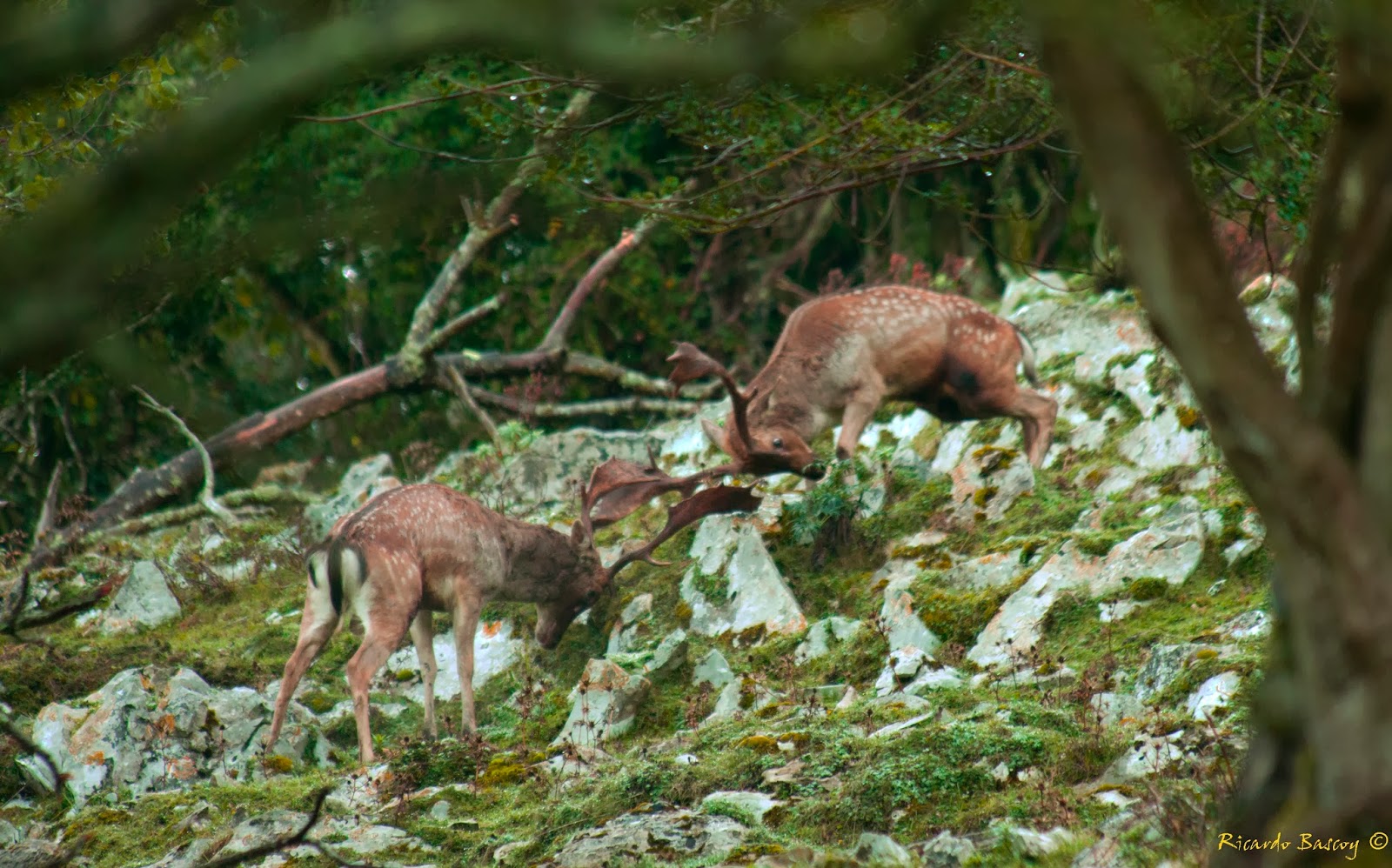 Los gamos sin un rival enfrente parecen débiles, cojean y miran con ternura o deseo a las hembras. En sus cuerpos las heridas de guerra dan una idea de la dureza de las luchas, las astas partidas, los golpes entre ellos no escatiman en fuerzas, todos quieren vencer para poder transmitir su herencia genética... Una glándula bajo el ojo se desarrolla estos días que desprende olor y que impregnan por todos lados...